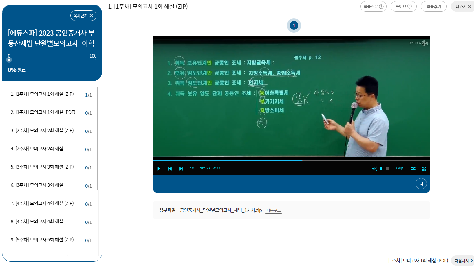 첨부파일 다운받고 학습을 진행하면 됩니다. 단, 공인중개사 주택관리사 교재는 에듀스파 온라인 서점에서 사회복지사1급 등은 메인에듀 온라인 서점에서 구매하셔야 된다는점~!