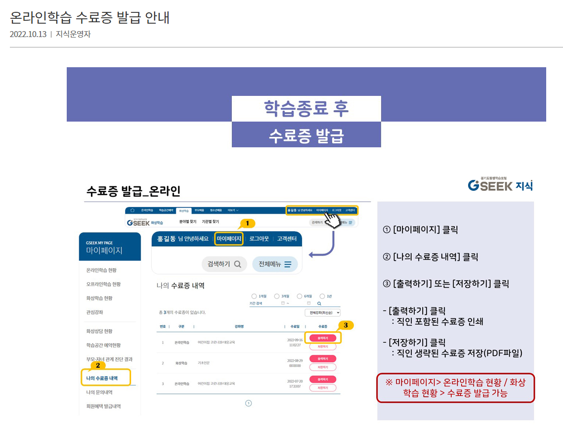 위 방법으로 경기도지식 사이트에서 원하는 정보와 서비스를 쉽게 찾아볼수 있고 온라인학습 수료증도 발급 가능하니 살펴보시고(안내페이지바로가기) 더 자세한 내용은 해당 사이트에서 직접 확인해 보시길 추천드립니다!