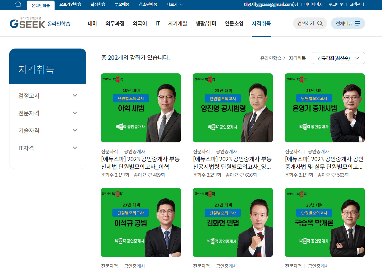상단메뉴 자격취득을 클릭해보시면 검정고시, 전문자격, 기술자격, IT자격 카테고리들이 보입니다. 전문자격 메뉴로 입장하시면 공인중개사 온라인 강의가 무려 무료입니다. 개념완성, 문제풀이, 단원별모의고사 커리큘럼 과정이 서비스 되고 있습니다.