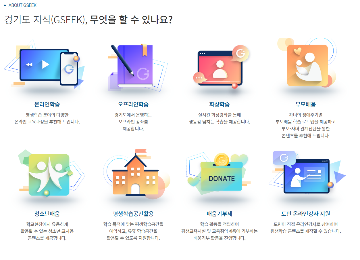 이 사이트는 경기도민들뿐만 아니라 일반 사용자들에게 다양한 정보와 서비스를 제공하여 생활에 도움을 주고자 하는 목적으로 운영되고 있습니다. 즉, 온라인 학습 강의만을 제공하는 간단한?~ 사이트가 아니라는 것입니다.