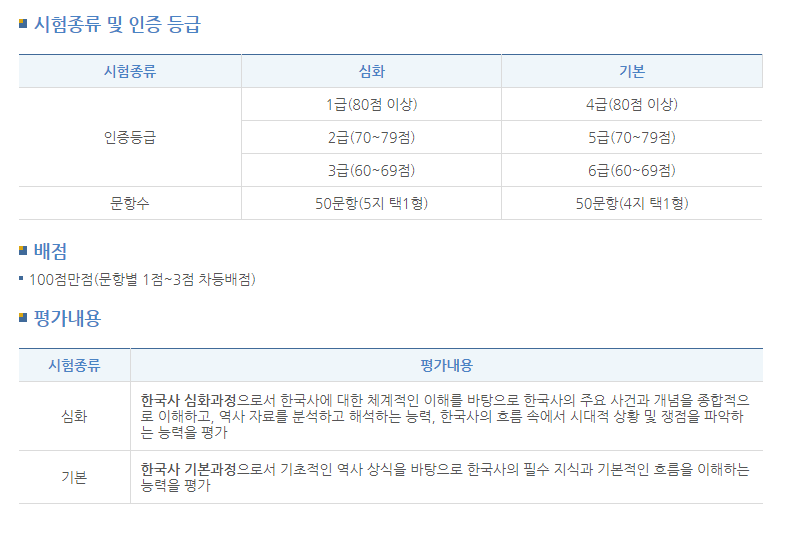 2006년부터 시행된 한국사능력검정시험은 연2회였으나 점차 늘려 2021부터는 연6회 시행되며 시험종류는 1,2,3급 심화시험과 4,5,6급 기본시험 2종이 있다. 문항수는 같지만 보기문항수가 다른데 한국사 주요사건과 개념을 체계적이고 종합적으로 이해하고, 한국사의 흐름속에서 역사 자료를 분석하고 해석하여 시대적 상황과 쟁점을 파악하는 심화시험은 50문항(5지 택1형), 기초적인 역사상식, 필수지식, 흐름을 이해하는 기본시험은 50문항(4지 택1형)으로 출제됩니다.