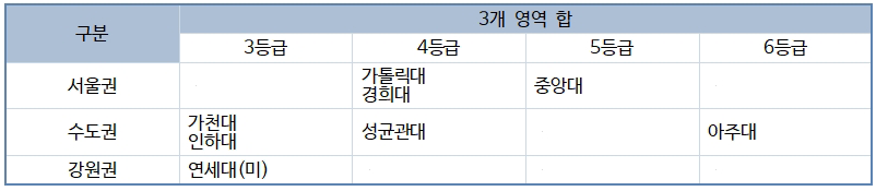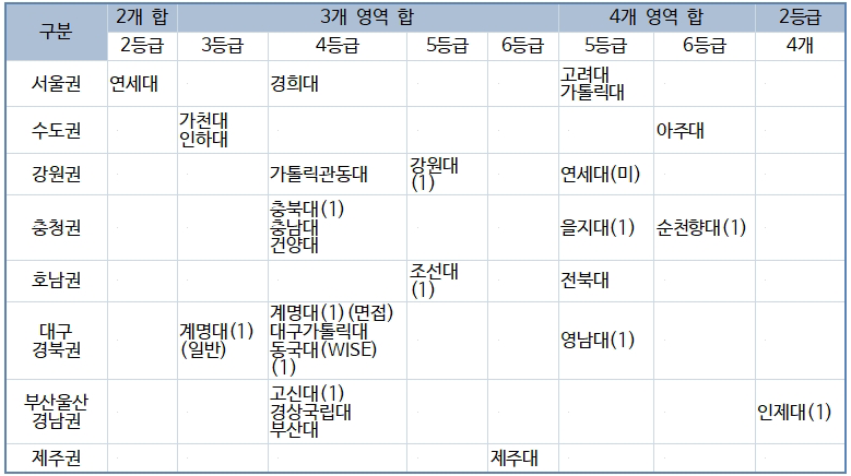 - 논술전형 (일반전형): 대부분 3합 5~6등급 수준.