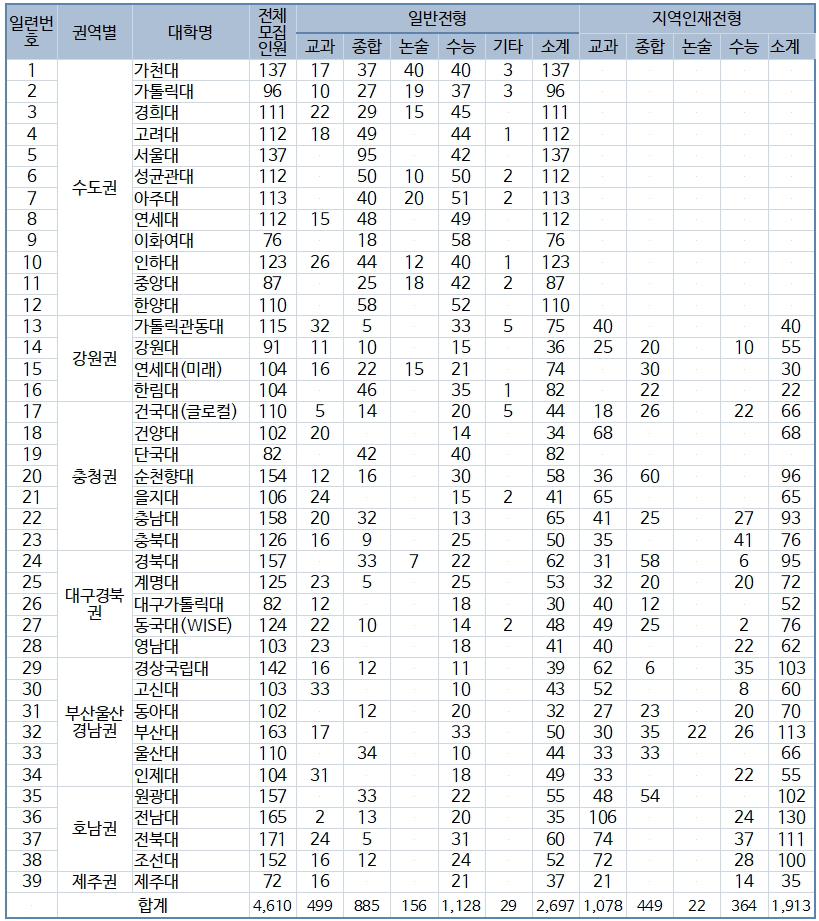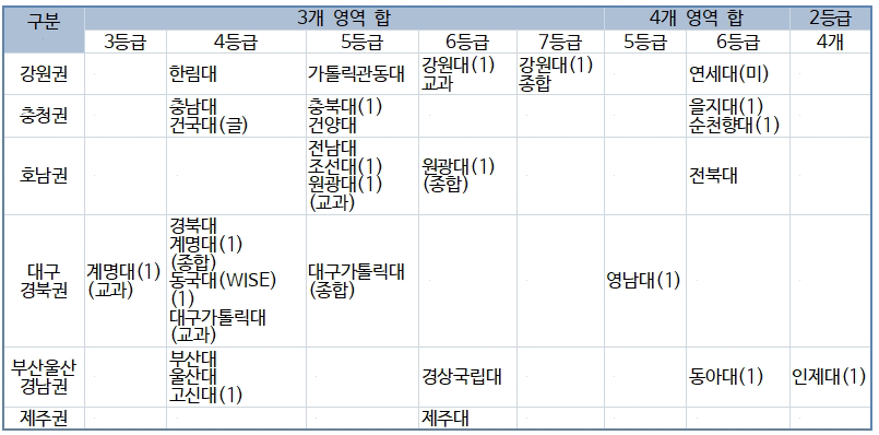- 지역인재전형: 대부분 3합 5~7등급 수준, 일부 대학은 4합 6~8등급 수준.