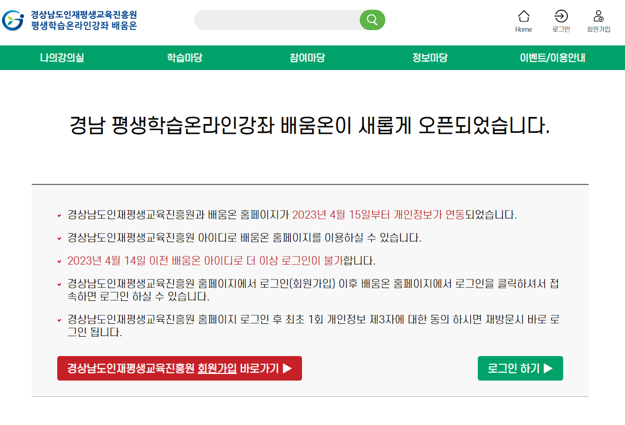 경상남도인재평생교육진흥원과 배움온 홈페이지가 2023년 4월 15일부터 개인정보 연동되었습니다. 2023년 4월 14일 이전 배움온 아이디로는 더이상 로그인이 불가하며 경남인재평생교육진흥원 아이디로 배움온 홈페이지를 이용할수 있습니다.