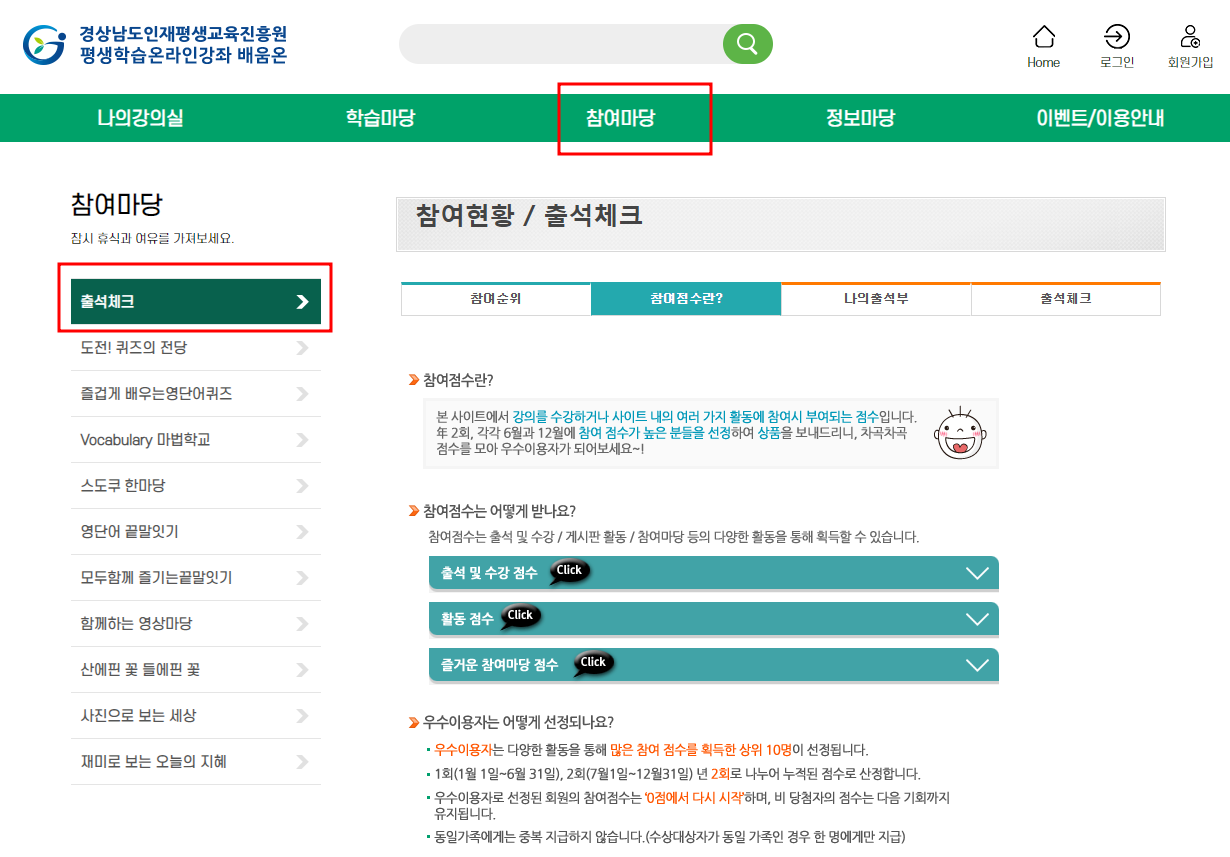 나의강의실 옆쪽에 [학습마당] 카테고리에 기초문해, 자격증, 외국어, 직업능력, 외국어, 법정의무교육 등의 다양한 온라인 콘텐츠들을 무료로 보실수 있으며 [참여마당] 분류에서는 참여점수를 올리며 이벤트에 당첨될수 있는 재미가 있네요. 사이트 요소요소가 알차게 구성되어 있습니다.