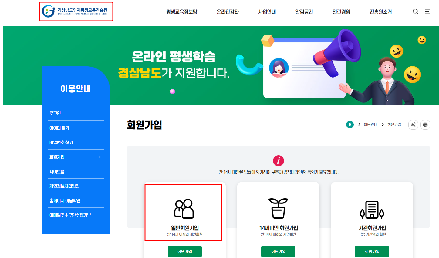 경상남도 거주자가 아니더라도 휴대폰으로 본인인증이 가능한 대한민국 국민이라면 누구나 가입 가능합니다. 그리고경남 배움온 사이트를 이용하기 위해서는 우선 경상남도인재평생교육진흥원 사이트에서 (1차) '일반회원가입' 해야합니다.