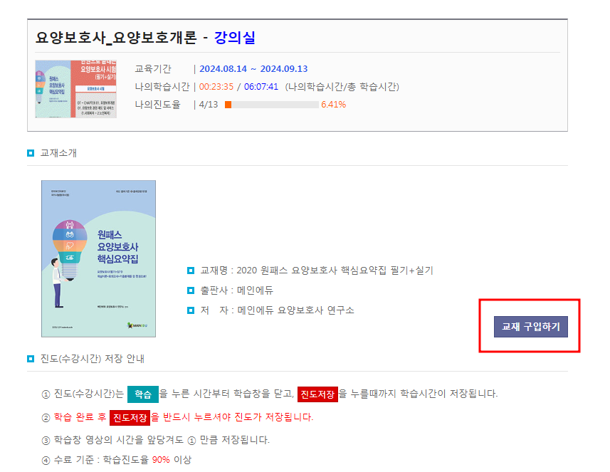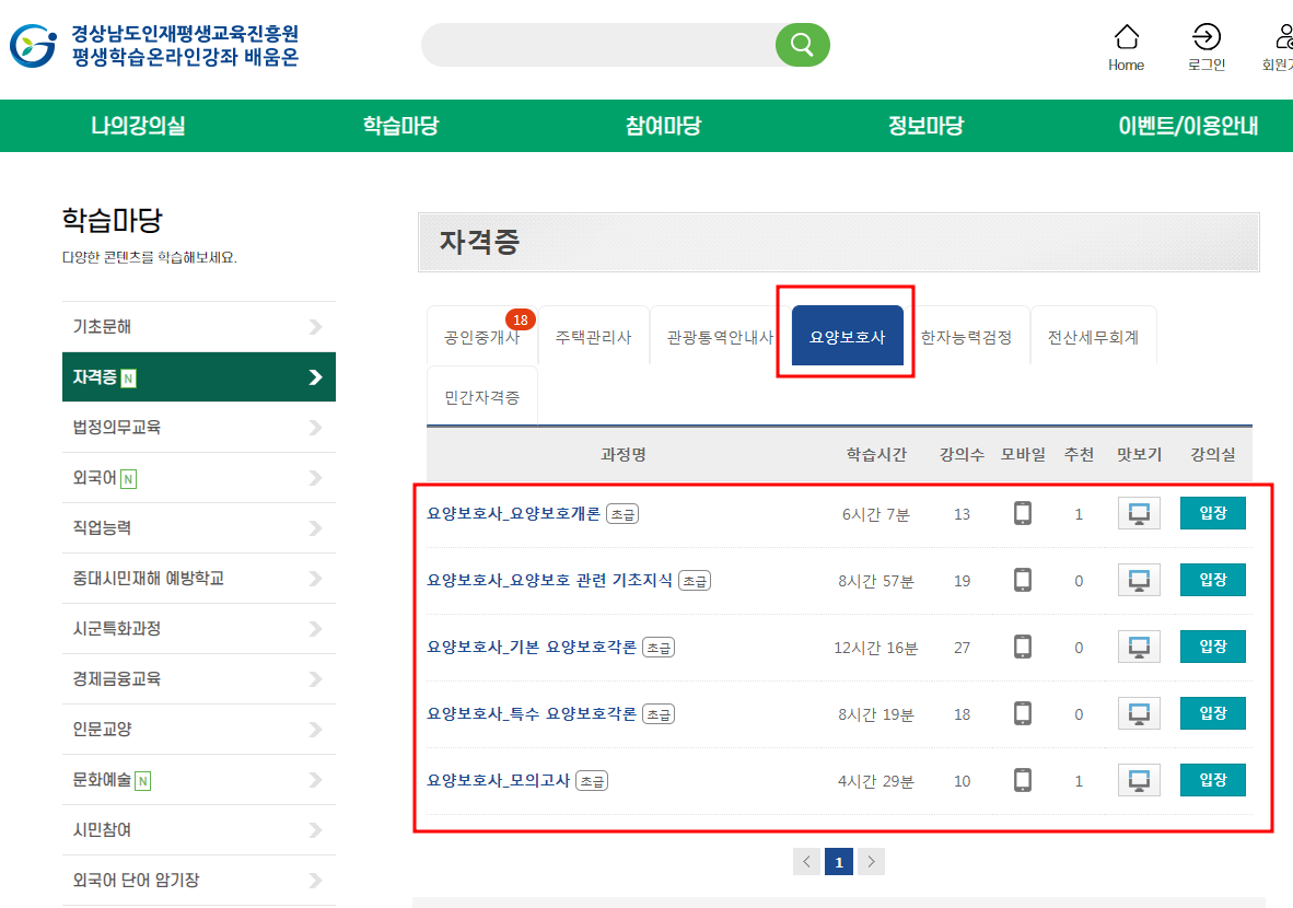 한국보건의료인국가시험원 국시원 요양보호사 시험 준비를 무료로 할수 있는 지자체 평생학습 교육 사이트를 소개합니다. 경상남도인재평생교육진흥원에서 운영하고 있는 평생학습온라인 강좌 배움온 사이트에서 요양보호개론, 관련 기초지식, 기본 요양보호각론, 특수 요양보호각론, 모의고사를 준비할수 있습니다. (*단, 교재는 구매하셔야 합니다.)