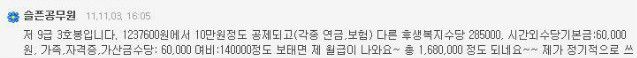 이 밖에 복리후생비, 초과근무, 출장수당, 명절비, 정근수당, 기타정액수당, 기타등등 3호봉 실수령액이 140~170만원 정도라고 합니다.(군대 제대 후 공무원이 되면 자동으로 3호봉이 인정됩니다.)