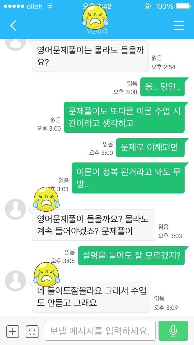 위 사진 속 대화내용은 대부분의 초보 수험생들의 최대고민, 영어과목에 대한 어려움을 얘기하는 밴드 대화내용입니다. 영어를 정복하지 않고, 아니 적어도 영어의 기초가 없는 학생이 공무원 시험을 합격하기란 정말 바늘구멍에 낙타가 들어가는 일만큼 어려운 일입니다. 공통과목인 국사까지 섭렵해야하는데 영어마저 기초가 부족하다면 아무리 선택과목들을 고득점을 받더라도 이를 극복하기 어렵기때문입니다.